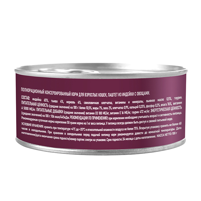 Состав: Индейка 65%, тыква 4%, морковь 4%, свекловичная клетчатка, витамины и минералы, льняное масло 0,5%, таурин. Питательная ценность: белки 10,5%, жир 7%, зола 2%, клетчатка 0,9%, кальций 0,25%, фосфор 0,2%, влага 76%. Энергетическая ценность (средние значения) на 100г: 111ккал. Витамины и минералы на 1 кг: витамин А 5000 МЕ/кг, витамин D3 180 МЕ/кг, витамин Е 16 МЕ/кг, таурин 472 мг/кг.