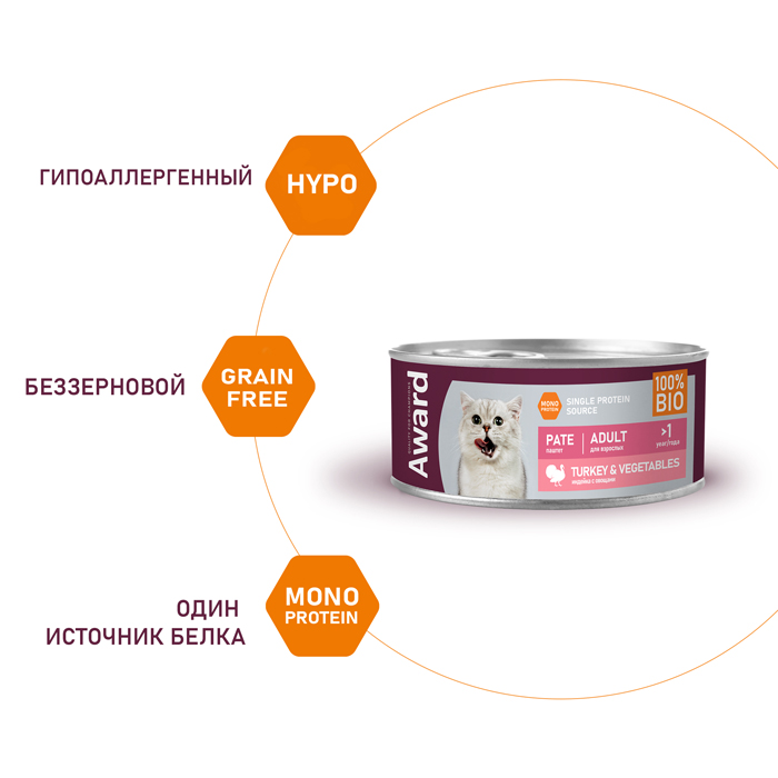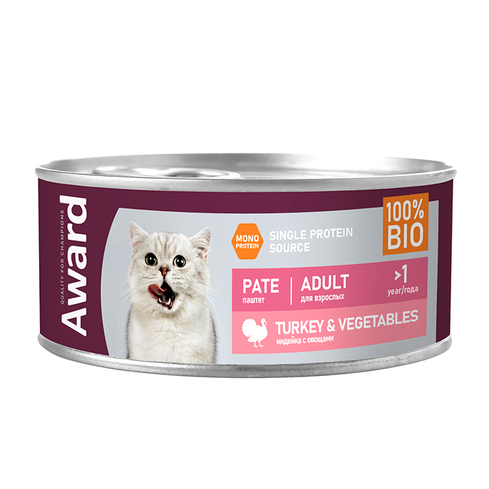 Влажный корм AWARD для взрослых кошек, паштет из индейки с овощами, 100г. Паштет из индейки с кусочками овощей для взрослых кошек - это монопротеиновое сбалансированное питание для любимого питомца, изготовленное из одного вида мясного белка без содержания зерна и глютена, с добавлением овощей и фруктов богатых витаминами и минералами. При кормлении необходимо учитывать возраст и активность питомца. Суточная норма кормления указана в таблице на упаковке или на сайте. У питомца всегда должен быть доступ к свежей питьевой воде.