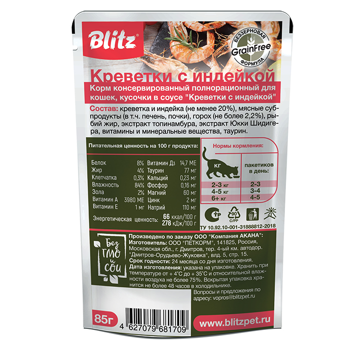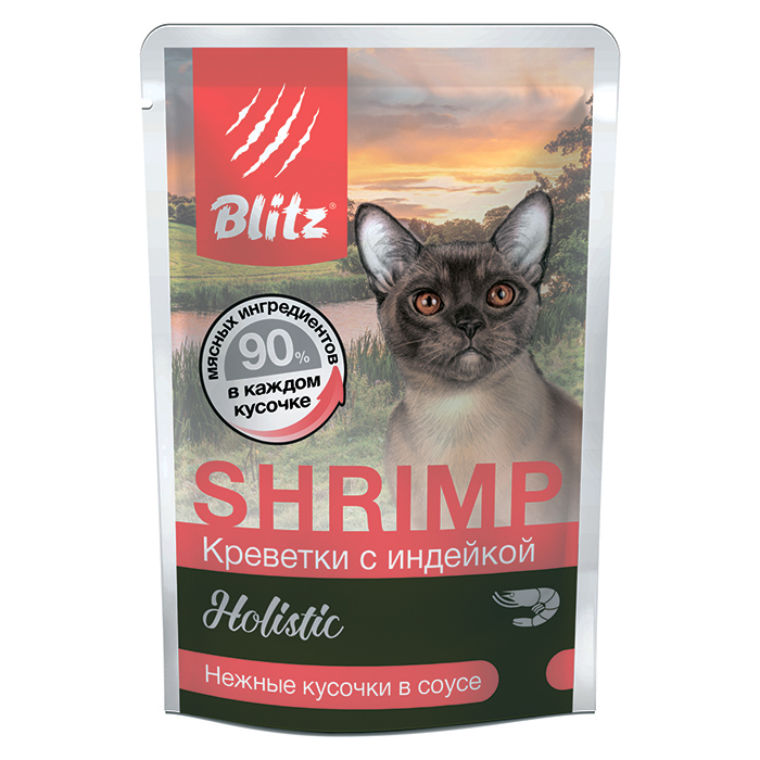 Blitz Holistic «Креветки с индейкой» нежные кусочки в соусе – влажный корм для взрослых кошек, 85г. Влажный корм для кошек «Креветки с индейкой» – настоящая жемчужина линейки Blitz Holistic. Изысканный вкус креветок оттеняется диетическим мясом индюшек и пикантным ароматом мясных субпродуктов. Это очень полезная и питательная смесь, которая усваивается кошками практически на 100%!