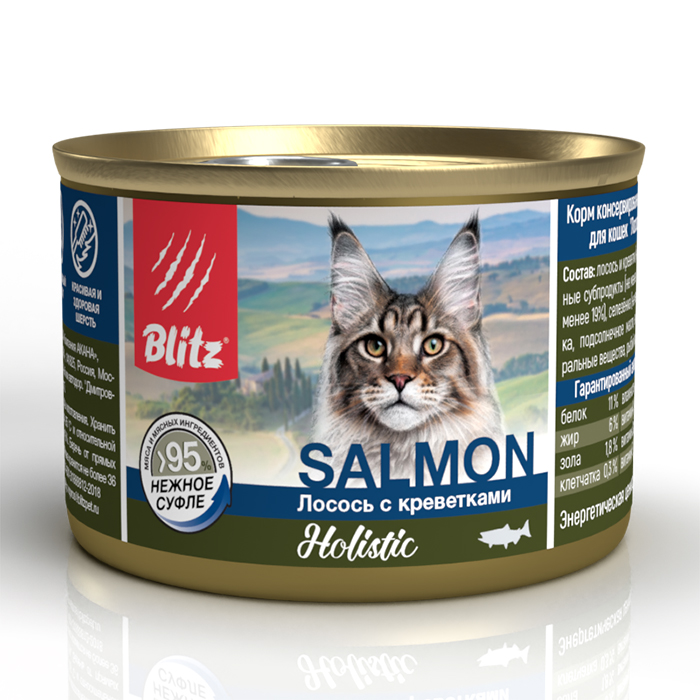 Нежное суфле линейки Blitz Holistic с натуральным лососем и мясом креветок – не просто сбалансированный полнорационный корм, а настоящий деликатес, и им можно кормить кошек на постоянной основе. Ваш любимец будет только благодарен! А его здоровье, настроение и внешний вид – скажут сами за себя. Консервы Blitz Holistic Salmon & Shrimps более чем на 95% состоят из животных ингредиентов, не содержат злаков и богаты всеми необходимыми аминокислотами, витаминами и минеральными веществами в легкоусвояемой форме. Мясо лососёвых – ценнейший источник белка и Омега-3 жирных кислот, которые отвечают за блестящую шерсть, здоровую кожу и сопротивляемость организма кошек к инфекциям. Оно богато витаминами D, A, E и подходит для питания животных, склонных к аллергии. Креветки придают влажному корму «Блиц Холистик» пикантный вкус и повышают общий тонус организма, ведь помимо чистейшего белка они содержат в большом количестве йод, необходимый для физического и умственного развития животных. А ещё мы включили в консервы мясо индейки и полезные субпродукты! Уникальная рецептура, тщательный выбор компонентов и бережная обработка делают суфле Blitz Holistic «Лосось с креветками» отличным выбором для кошек, знающих себе цену!