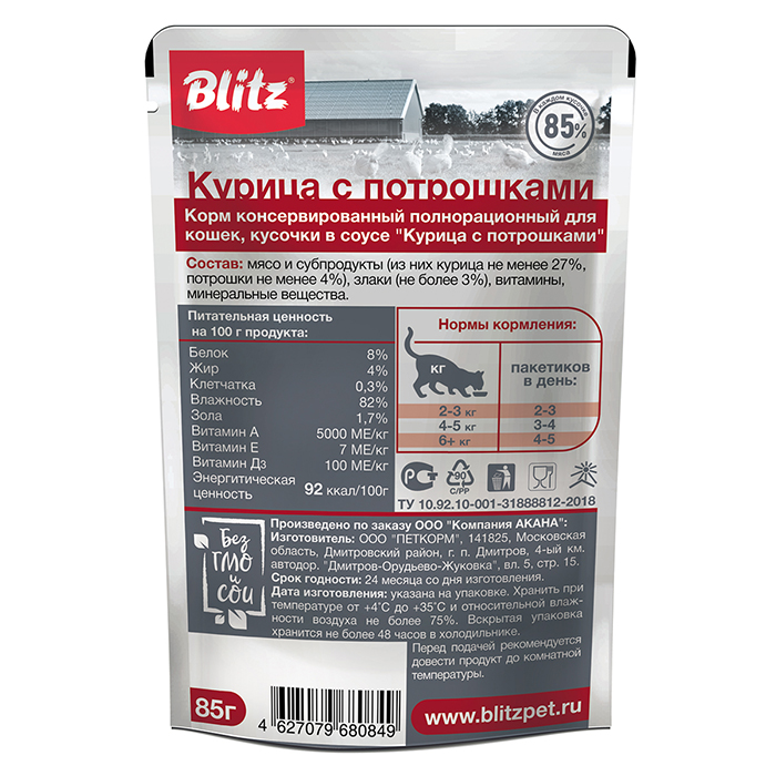 Для полноценного питания кошке нужно не только мясо как высококачественный источник животного белка, но и субпродукты, которые содержат множество витаминов, в особенности A и D, микроэлементов, например, фосфора, йода, железа, калия и магния, а также Омега-3 жирных кислот, необходимых для здоровья кожи и шерсти. Именно по этому принципу создан корм Blitz «Курица с потрошками», который полезен и нравится даже самым требовательным питомцам, привлекая их своим ароматом.