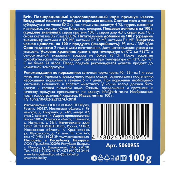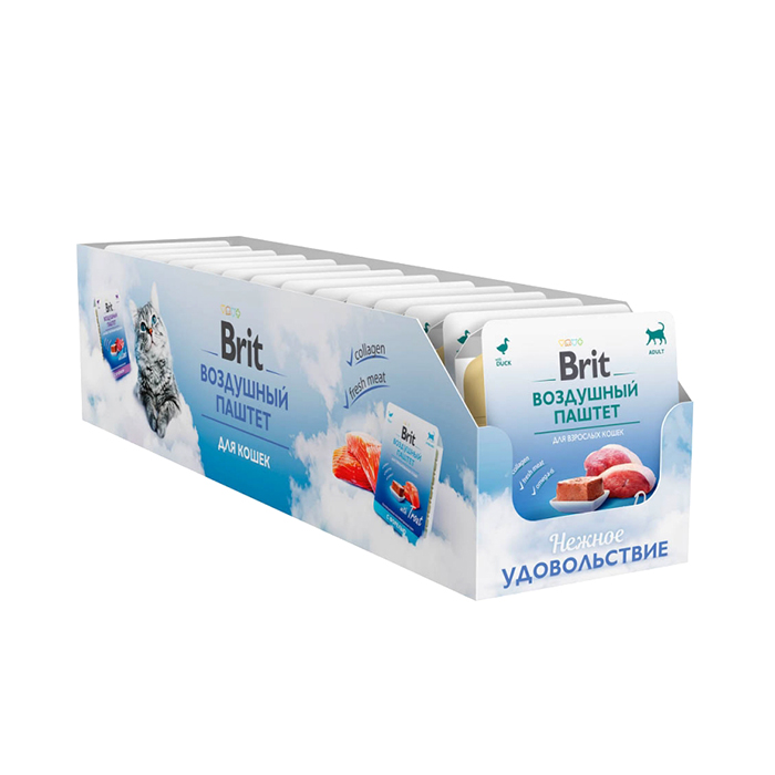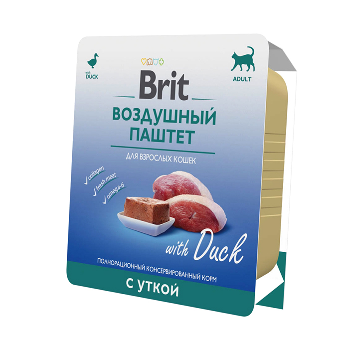 Brit Premium Воздушный Паштет с уткой для взрослых кошек, 100г. Полнорационный консервированный корм премиум класса с уткой для взрослых кошек. Технология производства воздушных паштетов — аэрация. Аэрация означает насыщение воздухом. Воздушные паштеты — высокотехнологичный продукт, который производится в специальном аппарате — паштетном эмульситаторе. Сырье одновременно измельчается, смешивается и взбивается, приоб¬ретая легкую, воздушную консистенцию. Не менее 74% в мяса в составе. Высокая поедаемость у кошек. Полнорационный состав и широкая линейка вкусов. Натуральные и гипоаллергенные ингредиенты. Не содержит искусственных ароматизаторов и консервантов. Содержит витамины и минералы для крепкого иммунитета. Сбалансирование содержание незаменимых аминокислот. Полноценный состав по жирорастворимым витаминам, необходимым организму для здоровья. Содержит цикорий — источник клетчатки и пребиотика инулина. Содержит Юкку, в которой содержатся фенолы и сапонины, которые способствуют снижению различных воспалений, помогают работе печени, стимулируют пищеварение. Благотворно влияют эти веще¬ства и на иммунитет, укрепляя весь организм. Имеет идеальную консистенцию. Упаковано в ламистер – алюминиевую упаковку нового поколения, что означает герметичность, безопасность и легкость открывания, легкий вес. Рекомендации по кормлению: суточная норма корма 40 - 55 г на 1 кг веса животного. Переход с предыдущего корма следует осуществлять постепенно, небольшими порциями в течение 5 - 7 дней. При кормлении необходимо учитывать активность и аппетит животного. У кошки всегда должен быть доступ к свежей питьевой воде.