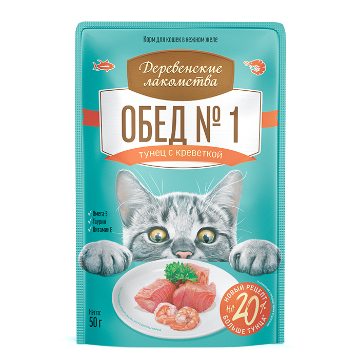 Деревенские Лакомства ОБЕД №1 влажный корм для кошек с тунцом и креветкой в желе, 50г