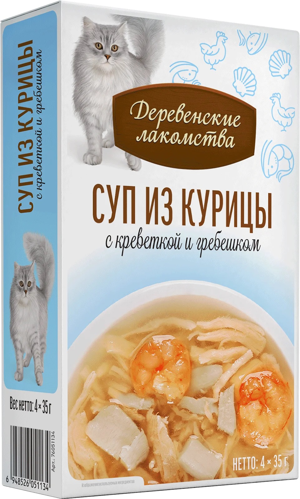 Деревенские Лакомства влажный корм для кошек, суп из курицы с креветкой и гребешком, 4шт по 35г
