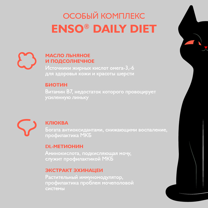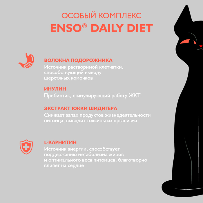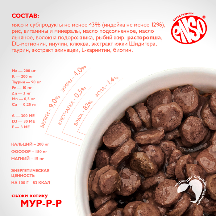 ENSO DAILY DIET кусочки в соусе с индейкой для здоровья печени, 85г. Полнорационный влажный корм с индейкой для поддержания здоровья печени взрослых кошек, кусочки в соусе. ENSO® DAILY DIET c индейкой обогащен необходимыми функциональными добавками для поддержки здоровья печени: Расторопша – содержит силимарин, обладающий доказанным гепатопротекторным действием. Индейка и рис – легкоусвояемые диетические ингредиенты, которые облегчают работу печени в процессе пищеварения и полезны для ее здорового функционирования. Благодаря сбалансированному составу и натуральным ингредиентам, нежные мясные кусочки ENSO® в аппетитном соусе очаруют кошек уже при первом знакомстве с кормом. Низкозерновая рецептура с тщательно подобранными витаминами и минералами, отсутствие ГМО и идеальное сочетание вкуса позволят взрослым и стерилизованным кошкам всегда оставаться активными и здоровыми, проявлять и сохранять свою настоящую сущность. Содержит волокна подорожника – источник растворимой клетчатки, способствующей выводу шерстяных комочков. Каждый рацион линейки ENSO® DAILY DIET содержит биоактивный комплекс с функциональными добавками, которые так необходимы организму домашней кошки: ✔ Масло льняное, рыбий жир – источники жирных кислот Омега-3, 6, благотворно влияющие на состояние кожи и шерсти ✔ Клюква – богата антиоксидантами, обладает противовоспалительным действием ✔ DL-метионин – аминокислота, подкисляющая мочу ✔ Инулин – пребиотик, стимулирует работу ЖКТ ✔ Экстракт эхинацеи –– растительный иммуномодулятор ✔ Экстракт юкки Шидигера – снижает запах продуктов жизнедеятельности питомца ✔ L-карнитин – источник энергии, способствует поддержанию метаболизма жиров и оптимального веса, благотворно влияет на сердце. ENSO® – раскрывая природу питомцев!