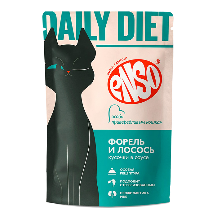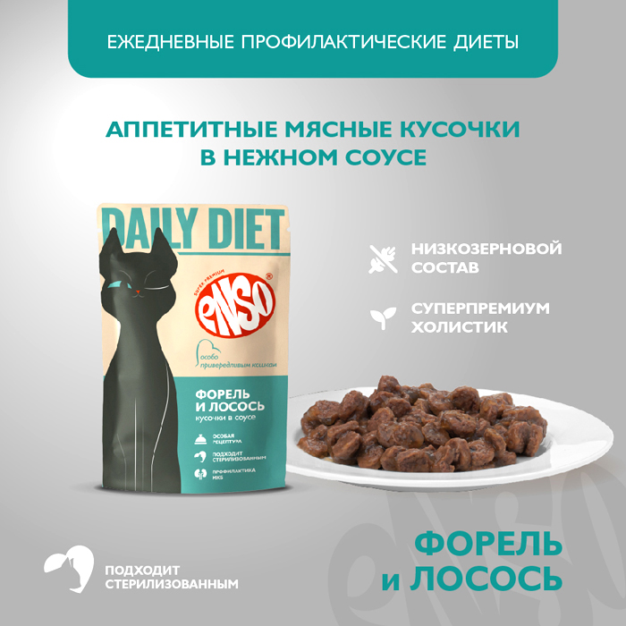 Энсо ДЕЙЛИ ДИЕТ влажный корм для привередливых кошек, кусочки в соусе с форелью и лососем, 85г, ENSO Daily Diet