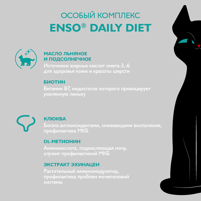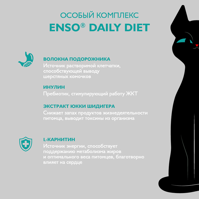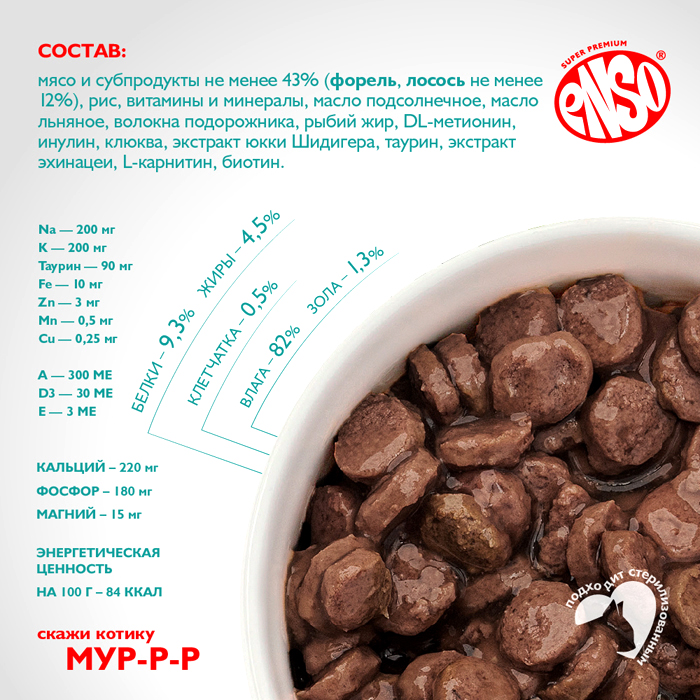 ENSO DAILY DIET кусочки в соусе с форелью и лососем, 85г. Полнорационный влажный корм с форелью и лососем для взрослых привередливых кошек, кусочки в соусе. ENSO® DAILY DIET c форелью и лососем идеально подойдет привередливым кошкам: Форель и лосось – 2 вида красной рыбы с ярким ароматом, вкусом и высокой биологической ценностью. Особый вкус – использование сложного рыбного вкуса заинтересует самых привередливых питомцев. Благодаря сбалансированному составу и натуральным ингредиентам, нежные мясные кусочки ENSO® в аппетитном соусе очаруют кошек уже при первом знакомстве с кормом. Низкозерновая рецептура с тщательно подобранными витаминами и минералами, отсутствие ГМО и идеальное сочетание вкуса позволят взрослым и стерилизованным кошкам всегда оставаться активными и здоровыми, проявлять и сохранять свою настоящую сущность. Содержит волокна подорожника – источник растворимой клетчатки, способствующей выводу шерстяных комочков. Каждый рацион линейки ENSO® DAILY DIET содержит биоактивный комплекс с функциональными добавками, которые так необходимы организму домашней кошки: ✔ Масло льняное, рыбий жир – источники жирных кислот Омега-3, 6, благотворно влияющие на состояние кожи и шерсти ✔ Клюква – богата антиоксидантами, обладает противовоспалительным действием ✔ DL-метионин – аминокислота, подкисляющая мочу ✔ Инулин – пребиотик, стимулирует работу ЖКТ ✔ Экстракт эхинацеи –– растительный иммуномодулятор ✔ Экстракт юкки Шидигера – снижает запах продуктов жизнедеятельности питомца ✔ L-карнитин – источник энергии, способствует поддержанию метаболизма жиров и оптимального веса, благотворно влияет на сердце. ENSO® – раскрывая природу питомцев!