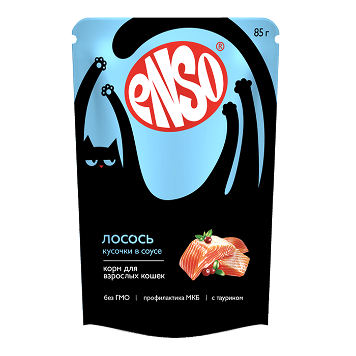 ENSO® Влажный полнорационный корм для взрослых кошек, кусочки в соусе с лососем, пауч 85г. Для изготовления корма использовано отборное мясо и мясные субпродукты первой категории от проверенных поставщиков. По своей природе кошки достаточно избирательны в еде, это практически запрограммировано в их ДНК. Благодаря сбалансированному составу и натуральным ингредиентам, нежные мясные кусочки ENSO® в аппетитном соусе очаруют кошек уже при первом знакомстве с кормом.