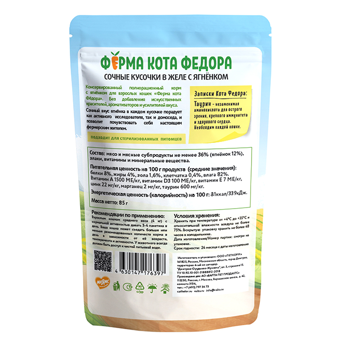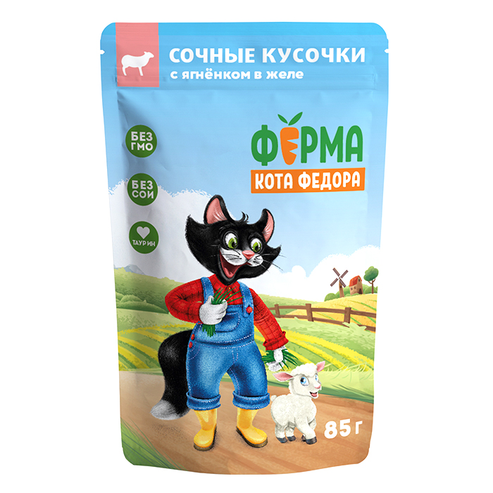 Влажный корм «Ферма кота Фёдора» для кошек, сочные кусочки в желе с ягненком, 85г. Влажный корм с Фермы кота Фёдора - это сбалансированный рацион, который обязательно понравится вашей кошке. Насыщенный вкус ягненка в желе порадует как активного исследователя, так и домоседа, и позволит почувствовать себя настоящим фермерским жителем. В корме 36% Мясных ингредиентов, а еще... Нет ГМО, сои, консервантов, ароматизаторов, усилителей вкуса и искусственных красителей. Кот Фёдор рекомендует! Суточная норма: Взрослым кошкам среднего веса (4 кг) с нормальной активностью давать 3-4 упаковки в день. Ваша кошка может съедать больше или меньше рекомендуемых количеств корма в день в зависимости от возраста, темперамента и активности. У животного всегда должен быть доступ к питьевой воде.