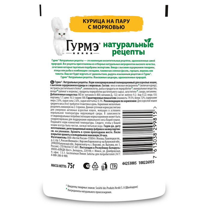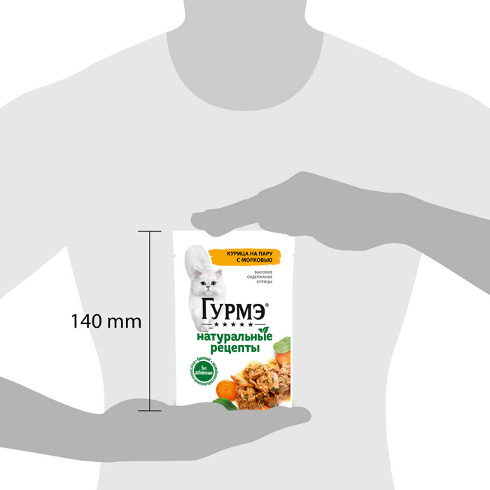Влажный корм Гурмэ® Натуральные рецепты для кошек, курица на пару с морковью, 75г. Природа вдохновляет шеф-поваров лучших ресторанов на создание блюд из натуральных ингредиентов, а вдохновленные природой эксперты разработали для кошек с избирательными предпочтениями коллекцию блюд Гурмэ® Натуральные рецепты. Корм для взрослых питомцев «Натуральные рецепты» — это блюда из отборных натуральных ингредиентов высокого качества. Сочетания приготовленных на пару мясных компонентов с овощами тщательно подобраны экспертами и оптимально дополняют друг друга по вкусу и пользе. Корм для кошек от Гурмэ® полнорационный, содержит все необходимые для здоровья микронутриенты. Влажный корм с богатой вкусовой палитрой не оставит равнодушным Вашего взыскательного гурмана. ✔ Комбинация белков и углеводов обеспечивает энергией ✔ Клетчатка благотворно влияет на работу пищеварительной системы ✔ Натуральные ингредиенты и восхитительный вкус ✔ Влажные корма Гурмэ® не содержат искусственных ароматизаторов и консервантов. Рекомендации по кормлению: Для взрослой кошки среднего веса (4 кг) требуется 3-4 пакетика в день. Кормление желательно разделить минимум на два приема. Данная суточная норма рассчитана для умеренно активных взрослых кошек, живущих в условиях нормальной температуры окружающей среды. В зависимости от индивидуальных потребностей кошки норма кормления может быть скорректирована для поддержания нормального веса Вашей кошки. Подавайте корм комнатной температуры. Следите, чтобы у Вашей кошки всегда была чистая, свежая питьевая вода.