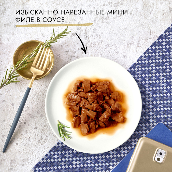 Состав: мясо и мясные ингредиенты (включая телятину), экстракты растительного белка, рыба и продукты ее переработки, аминокислоты, минеральные вещества, загустители, продукты переработки растительного сырья, сахара, витамины, ароматизатор говядины. Гарантированные показатели: влажность: 82,0%, белок: 11,5%, содержание жира: 2,5%, сырая зола: 2,0%, сырая клетчатка: 0,2%. Добавленные вещества: МЕ/кг: витамин А: 600; витамин Д3: 90; мг/кг: железо: 6,8; йод: 0,16; медь: 0,5; марганец: 1,3; цинк: 12; таурин: 370.