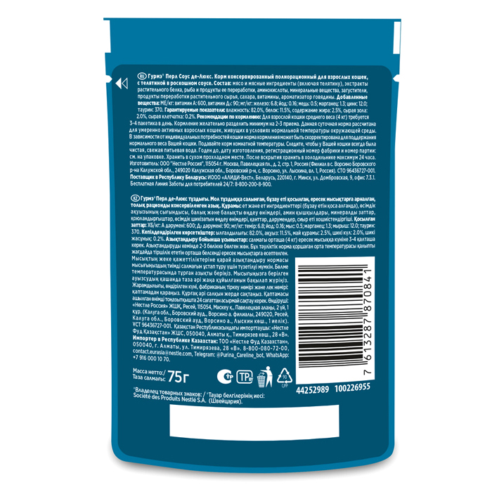 Влажный корм Гурмэ Перл Соус Де-люкс для кошек, с телятиной в роскошном соусе, 75г. Именно изысканный соус может придать невероятный вкус даже знакомому блюду. Эксперты, создавая для взыскательных кошек коллекцию блюд-шедевров Гурмэ® Перл, разработали специальные насыщенные соусы, которые обогащают вкусовую палитру любимого блюда. Корм для взрослых питомцев «Перл Соус де-Люкс» — это тщательно отобранные нежные кусочки мини-филе с лососем, телятиной, говядиной или курицей в роскошном ароматном соусе с шелковистой текстурой. Корм для кошек от Гурмэ® полнорационный, содержит все необходимые для здоровья микронутриенты. Влажный корм с богатой вкусовой палитрой не оставит равнодушным Вашего пушистого гурмана. ✔ Комбинация белков и углеводов обеспечивает энергией ✔ Клетчатка благотворно влияет на работу пищеварительной системы ✔ Влажные корма Гурмэ® не содержат искусственных ароматизаторов и консервантов. Рекомендации по кормлению: Для взрослой кошки среднего веса (4 кг) требуется 3-4 пакетика в день. Кормление желательно разделить минимум на два приема. Данная суточная норма рассчитана для умеренно активных взрослых кошек, живущих в условиях нормальной температуры окружающей среды. В зависимости от индивидуальных потребностей кошки норма кормления может быть скорректирована для поддержания нормального веса Вашей кошки. Подавайте корм комнатной температуры. Следите, чтобы у Вашей кошки всегда была чистая, свежая питьевая вода.