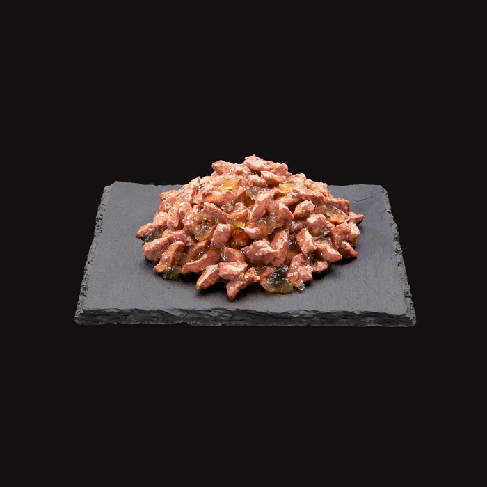 Состав: Мясные кусочки (мясо и субпродукты (в том числе индейка 35%, говядина и курица), минеральные вещества, витамины, мякоть сахарной свеклы, таурин) и желе (вода, аминокислоты, загустители, сахара). Энергетическая ценность (100 г): 85 ккал / 356 кДж. Содержание питательных веществ (100 г): белок – 8,7 г; жир – 4,5 г; зола – 2,0 г; клетчатка – 0,2 г; влага – 82 г; витамин А – не менее 200 МЕ. Добавленные вещества (1 кг): витамин Е – 50 мг; витамин D3 – 220 МЕ; железо – 19 мг; медь – 3,2 мг; марганец – 3,2 мг; цинк – 52,8 мг; йод – 0,8 мг.
