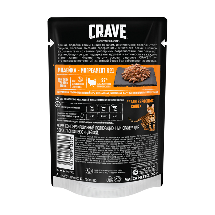 Влажный корм CRAVE™ для взрослых кошек, содержащий минимум 99% ингредиентов животного происхождения, вдохновлен естественным рационом кошки. Ингредиент № 1 в нем — настоящее мясо. Это придает питомцу энергию, насыщает белком и поддерживает организм в тонусе. Собаки и кошки — прирождённые хищники и инстинктивно выбирают пищу, богатую животным белком. Именно поэтому мы создали для них CRAVE™. Рекомендации по кормлению: Следует кормить кошку согласно рекомендованным кормам. Рядом с местом кормления должна быть миска со свежей питьевой водой. При массе кошки 3 кг рекомендуемое количество упаковок влажного корма в сутки – 3 шт. При массе кошки 4 кг – 3,5 шт. При массе кошки 5 кг – 4 шт.