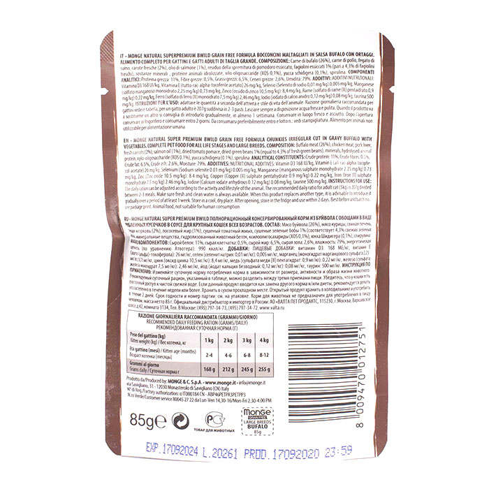 Монж Би Вайлд ЛАДЖ БРИД влажный корм для крупных кошек с буйволом и овощами, 85г, MONGE BWild Large Breed