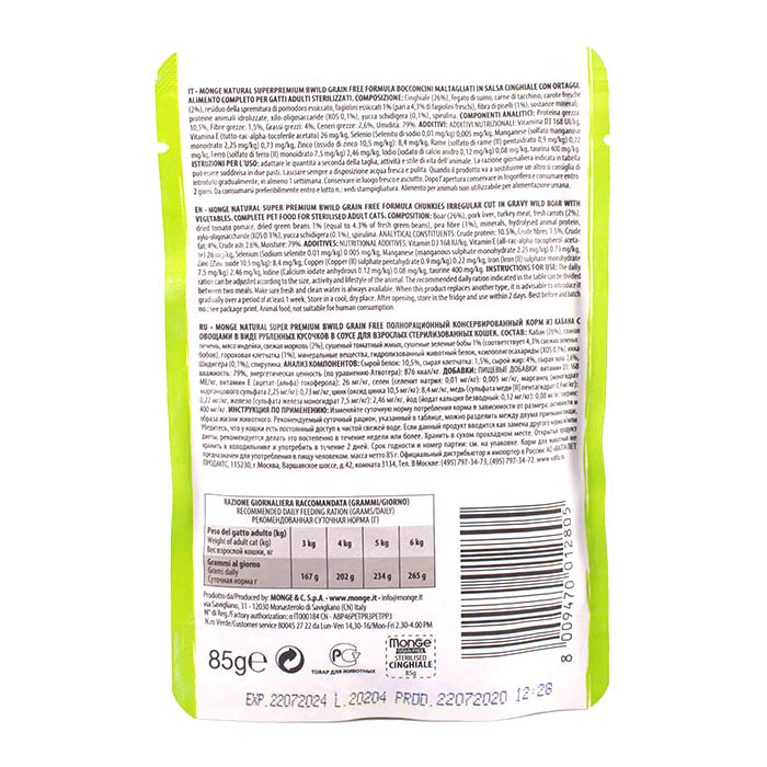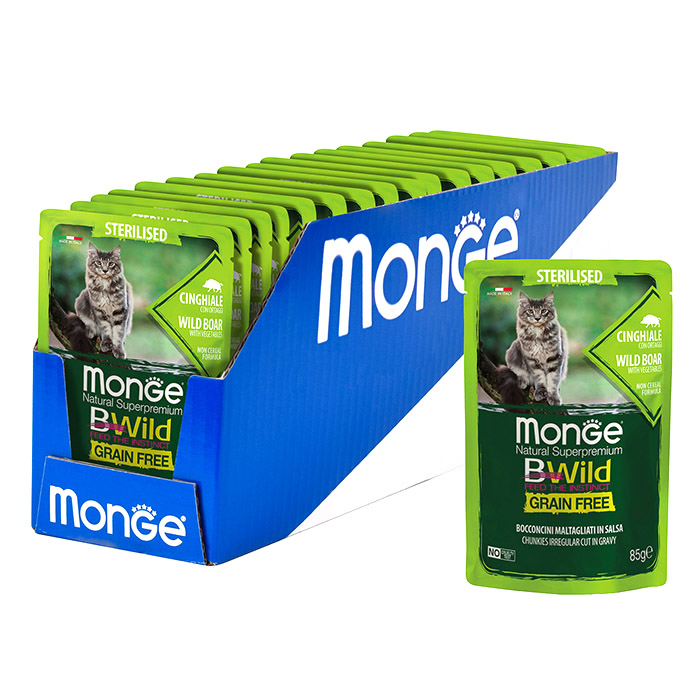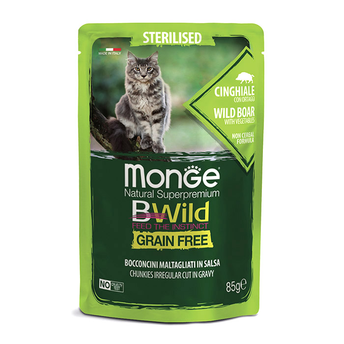 Monge Cat BWild Grain Free паучи из мяса кабана с овощами (зеленая фасоль и морковь) для стерилизованных кошек – это полноценное сбалансированное питание для стерилизованных кошек.
