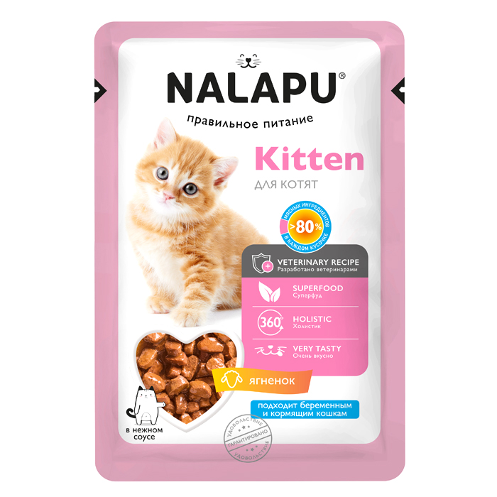 Корм влажный (паучи) НАЛАПУ (NALAPU) Kitten для котят, сочные кусочки с ягненком в нежном соусе, 77 г. Полнорационный консервированный корм для котят с 1 месяца до 1 года. Подходит беременным и кормящим кошкам.