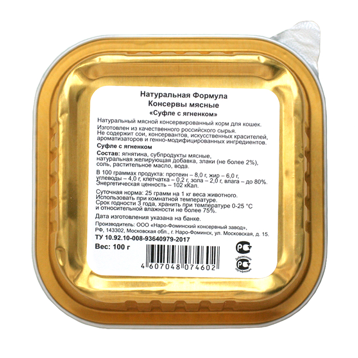 Корм-суфле с мясом ягнёнка в ламистере 100 г. подходит кошкам, склонным к пищевой аллергии и набору веса. Низкокалорийное, богатое аминокислотами и селеном мясо подходит животным с чувствительным пищеварением. Мясо ягнёнка входит в группу диетических маложирных продуктов и даёт ненасыщенные жирные кислоты и лецитин, запас необходимого белка вашей кошке. Корм подходит для взрослых и стерилизованных животных, любящих спокойный досуг. С влажным кормом для кошек с мясом ягнёнка в консистенции суфле, ваша кошка получит полновесный ежедневный рацион с заботой о её нуждах и пищевых особенностях в одной упаковке. "Натуральная формула" - марка российского производителя кормов с 12 летним опытом и широкой линейкой продуктов премиум, суперпремиум класса из натуральных мясных компонентов: без сои, ГМО, искусственных красителей, усилителей вкуса, без мясокостной и перьевой муки. Натуральная формула – натуральный продукт!