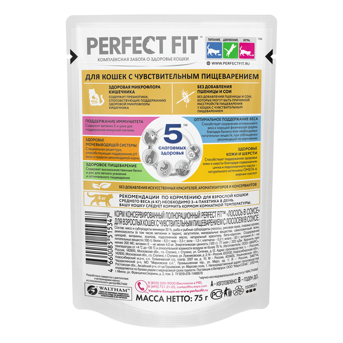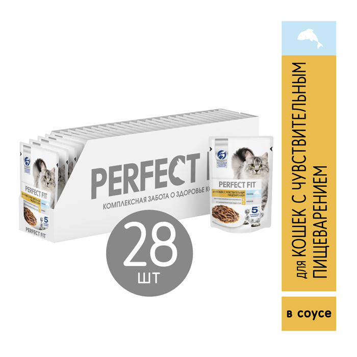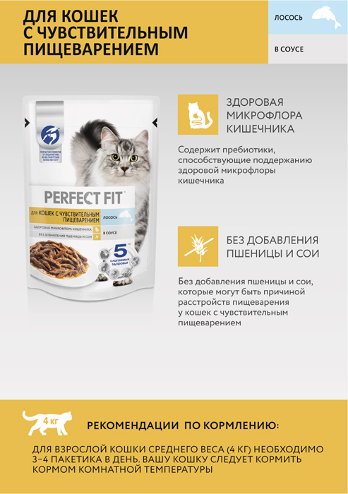 Перфект Фит СЕНСИТИВ влажный корм для кошек с чувствительным пищеварением, с лососем в соусе, 75г, PERFECT FIT Sensitive