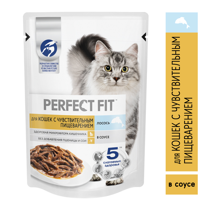 Влажный корм в паучах PERFECT FIT™ с лососем в соусе для кошек с чувствительным пищеварением. Содержит пребиотики, способствующие поддержанию здоровой микрофлоры кишечника питомца. Без добавления пшеницы и сои, которые могут быть причиной расстройств пищеварения у кошек с чувствительным пищеварением.