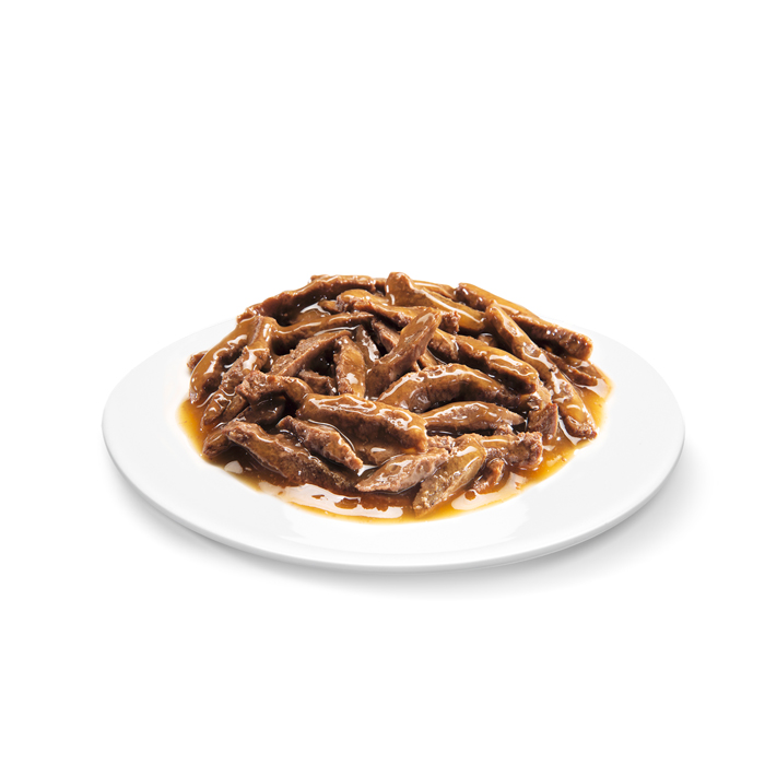 Состав: мясо и субпродукты минимум 30%, рыба и рыбные субпродукты (лосось), рисовая мука, плазма крови, аминокислоты (в том числе метионин и таурин), загустители, минеральные вещества, свекловичный жом, цикорий, витамины, ксилоза, подсолнечное масло, натуральный краситель бета-каротин. Содержание питательных веществ (100г): белок - 8,5г; жир - 3,5г; зола - 1,5г; клетчатка - 0,2г; влага - 83г; витамин А - не менее 200 МЕ; витамин E - не менее 4,0 мг. Энергетическая ценность (100г): 77 кКал / 322 кДж.