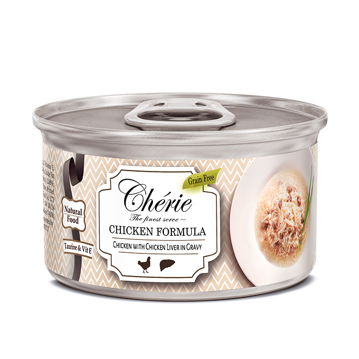 Pettric Cherie Signature gravy, курица с печенью, 80г. Нежное измельченное филе куриной грудки с кусочками куриной печени в пикантном соусе. Благодаря натуральному вкусу и фирменному соусу Chérie, это настоящая кошачья сенсация!