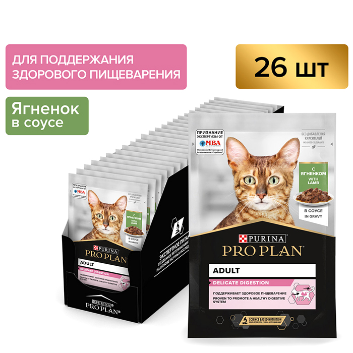 Про План ДЕЛИКАТ влажный корм для кошек с чувствительным пищеварением, с ягненком в соусе, 85г, PRO PLAN Delicate Digestion