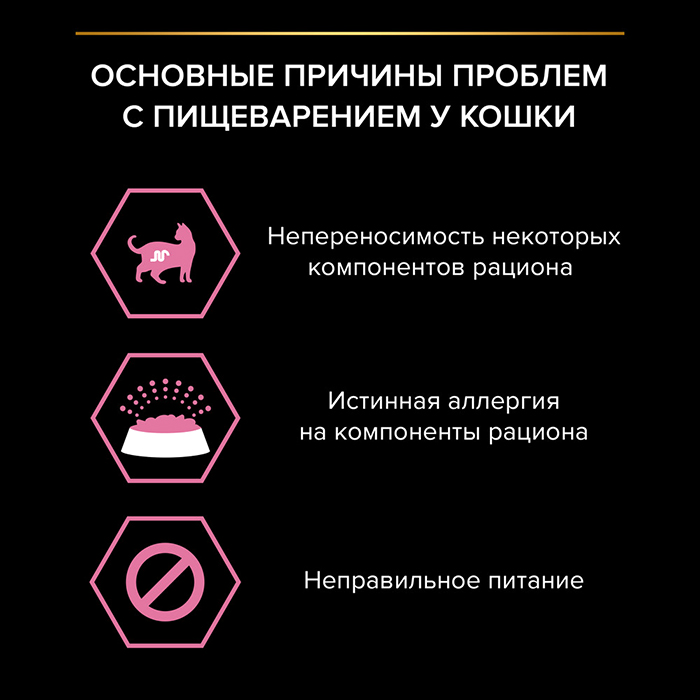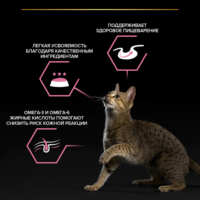 Качественные ингредиенты такие как: треска, птица и индейка способствуют тщательному перевариванию пищи. Помогает уменьшить кожные реакции, связанные с пищевой непереносимостью. Нежные кусочки в пикантном соусе очень привлекательны для кошек благодаря запатентованной технологии производства департамента PURINA® компании Nestle®. Доказано: способствует улучшению пищеварения благодаря содержанию инулина, пребиотика, который помогает сбалансировать кишечную флору кошек с повышенной чувствительностью.