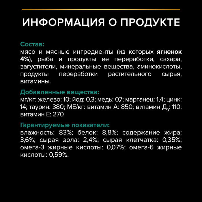 Добавленные вещества: МЕ/кг: витамин А: 1035; витамин D3: 145. Мг/кг: железо: 30; йод: 0,58; медь: 3,7; марганец: 5,3; цинк: 73; селен: 0,049. Гарантированные показатели: влажность: 83%; белок: 8,5%; жир: 4,2%; сырая зола: 2,3%; сырая клетчатка: 0,4%.