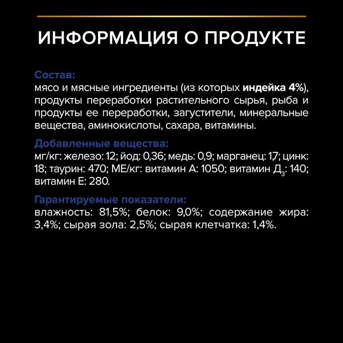 Состав: Мясо и субпродукты (из которых 8% индейка), экстракты растительных белков, злаки, рыба и продукты переработки рыбы, сахара, минеральные вещества. Добавленные вещества: МЕ/кг: Витамин А: 1065, Витамин D3: 145, Мг/кг: Железо: 10,2, Йод: 0,39, Медь: 0,97, Марганец: 1,8, Цинк: 27,6, Селен: 0,023. Гарантированные показатели: влажность: 80%; белок: 12%; жир: 3,5%; сырая зола: 2,2%; сырая клетчатка: 0,07%.