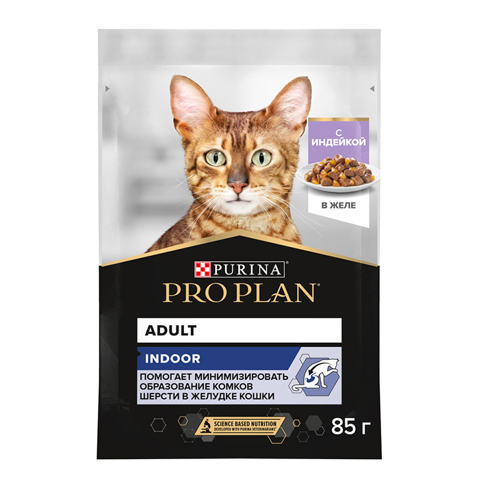 Для кошек, живущих дома. С индейкой в желе. Снижение образования комков шерсти в желудке благодаря высокому содержанию клетчатки. Содержание пребиотиков способствует здоровому пищеварению и уменьшению запаха из лотка. Высокое содержание белка способствует поддержанию идеальной массы тела. Нежные кусочки в желе очень привлекательны для кошек благодаря запатентованной технологии производства департамента PURINA® компании Nestle®.
