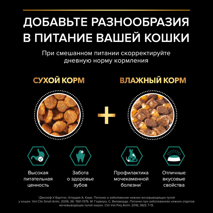 Помогает поддерживать здоровье мочевыделительной системы у кастрированных котов и стерилизованных кошек. Способствует поддержанию оптимального веса тела кошки. Помогает поддерживать естественную защиту организма благодаря содержанию антиоксидантов, таких как витамин Е. Нежные кусочки в пикантном соусе обладают приятным вкусом благодаря запатентованной технологии производства департамента PURINA® компании Nestle®.