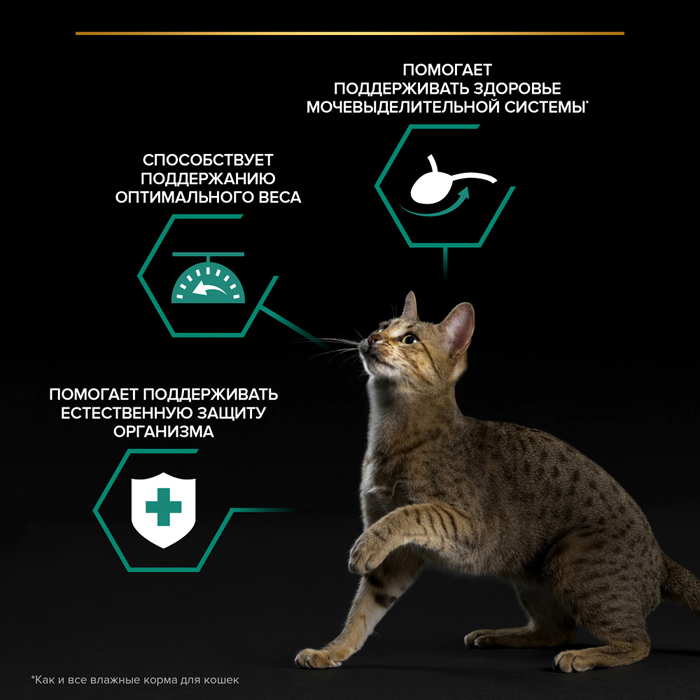 Помогает поддерживать здоровье мочевыделительной системы у кастрированных котов и стерилизованных кошек. Способствует поддержанию оптимального веса тела кошки. Помогает поддерживать естественную защиту организма благодаря содержанию антиоксидантов, таких как витамин Е. Нежные кусочки в пикантном соусе обладают приятным вкусом благодаря запатентованной технологии производства департамента PURINA® компании Nestle®.