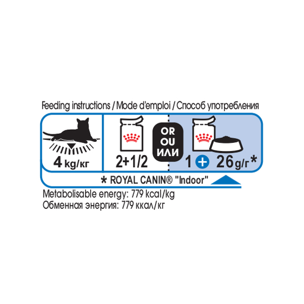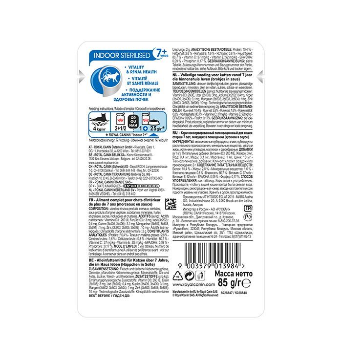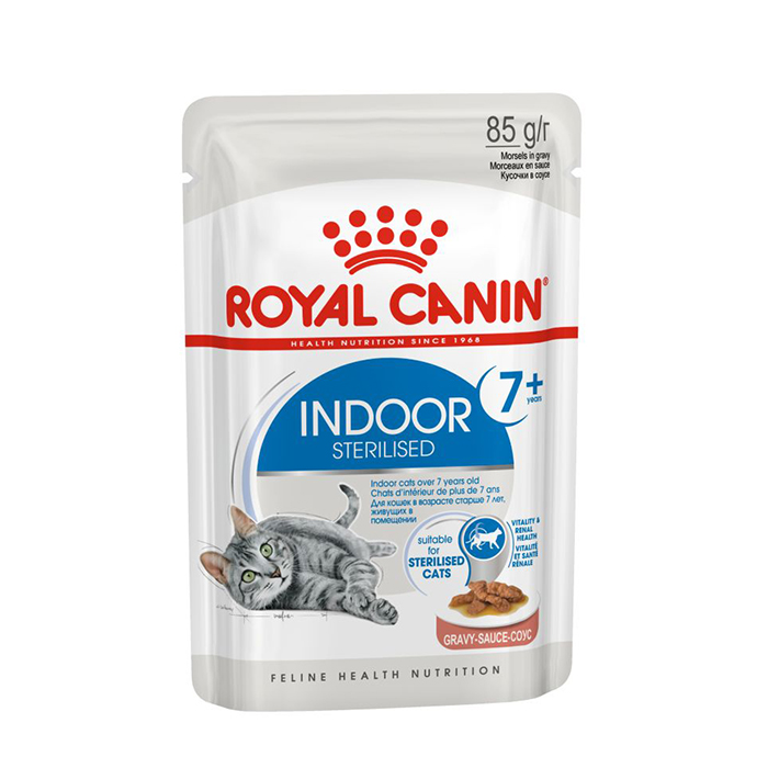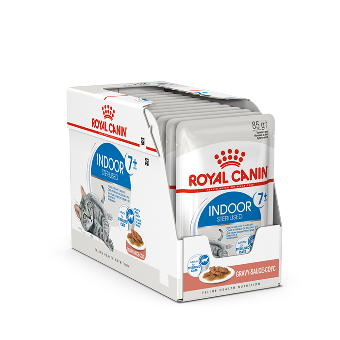 При первых признаках старения взрослым кошкам, постоянно живущим в помещении, для поддержания оптимального здоровья особенно важно получать полноценное сбалансированное питание. ROYAL CANIN® Indoor 7+ years в соусе предназначен для кошек старше 7 лет, постоянно живущих в помещении, и разработан с учетом потребностей таких кошек в питательных веществах. Влажный Корм Indoor Sterilised 7+ years в соусе содержит белки с высокой усвояемостью (L.I.P.)*, оптимальный процент клетчатки и специальный комплекс нутриентов, стимулирующие пищеварение. Корм обладает балансом минеральных веществ и оптимальным содержанием фосфора, что помогает поддерживать здоровье мочевыделительной системы взрослой кошки, а жирные кислоты Омега 3 и 6 - здоровье кожи и шерсти. Кроме того, Indoor Sterilised 7+ years в соусе включает в себя энергетическое соотношение белков, жиров и углеводов, интинктивно предпочитаемое большинством кошек, а низкая калорийность способствует чувству насыщения. Жирные кислоты EPA-DHA в сочетании с хондроитином и глюкозамином помогают поддерживать здоровье суставов кошки и бороться с первыми признаками старения.