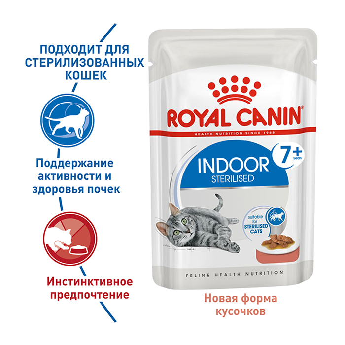 Роял Канин ИНДОР СТЕРИЛАЙЗД 7+ влажный корм для стерилизованных кошек старше 7 лет, живущих в помещении, кусочки в соусе, 85г, ROYAL CANIN Indoor Sterilised 7+