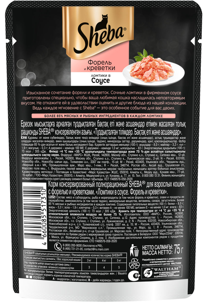 Шеба влажный корм для кошек, ломтики в соусе с форелью и креветками, 75г, SHEBA Core