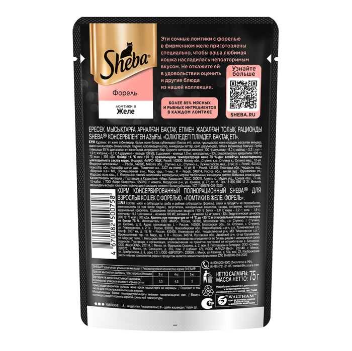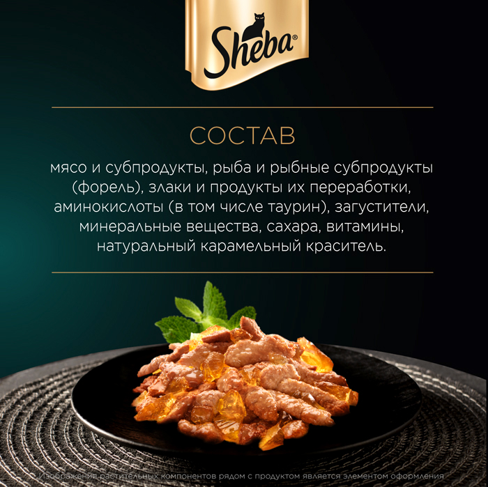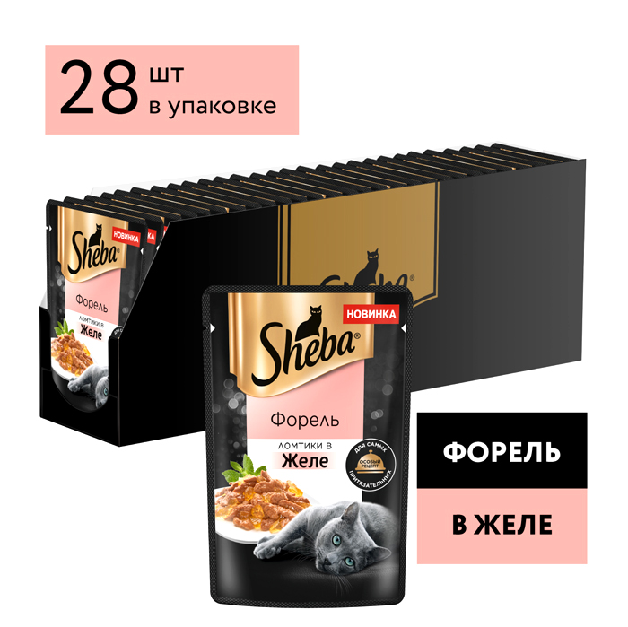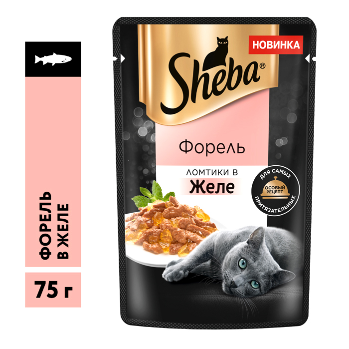 Влажный корм для кошек Sheba® Ломтики в желе с форелью, 75г. Сочные ломтики с форелью в ароматном желе - блюдо из высококачественных ингредиентов, которое придётся по вкусу самым притязательным кошкам. Мы приготовили его по особому рецепту, чтобы раскрыть всю красоту вкуса и сохранить баланс витаминов, минералов и аминокислот, необходимых вашей любимице. Подарите своей кошке особое удовольствие, побаловав ее всеми блюдами из коллекции SHEBA®.