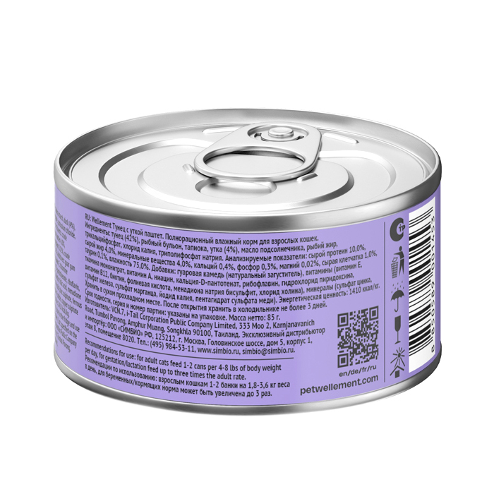"Wellement" с тунцом и уткой, паштет для взрослых кошек, 85г. Полнорационный влажный корм для взрослых кошек. Если бы герой популярной детской сказки, Кот в сапогах, был настоящим, наверняка его излюбленной едой стала бы благородная комбинация из мяса утки и рыбы. Наши домашние котики во многом похожи на сказочного персонажа: они умные и хитрые, но при этом преданные друзья. Иногда даже кажется, что они вот-вот заговорят человеческим голосом. Порадуйте своего мурчащего друга поистине королевским паштетом из тунца и утки. Нежный паштет из рыбы и утки - это гармония ароматов и вкусов в каждой порции. Полезная смесь мяса птицы и рыбы создаёт уникальный баланс питательных веществ. Мы уделяем особое внимание качеству продукта, потому что верим, что ваша кошка заслуживает только лучшее. Не упустите шанс подарить вашему питомцу безмерное океаническое удовольствие с продуктами Wellement!