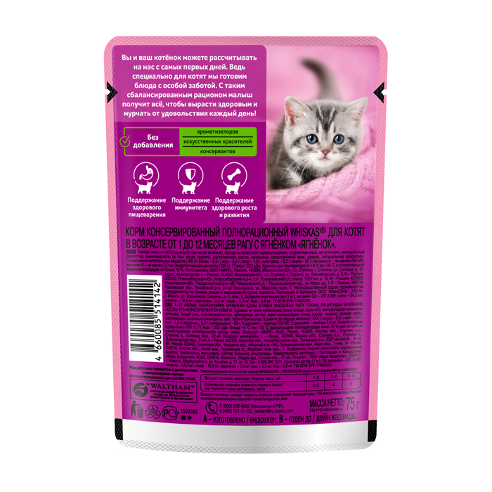 Первый год в жизни котенка - главное время в формировании его организма. И именно рацион Whiskas для котят поможет ему получить все питательные вещества, витамины и минералы. Вкус и нежность блюд понравятся вашему малышу, а здоровое взросление котенка порадует вас. Узнайте больше на whiskas.ru. Здоровый рост. Поддержание иммунитета. Здоровье костей. Без добавления консервантов.