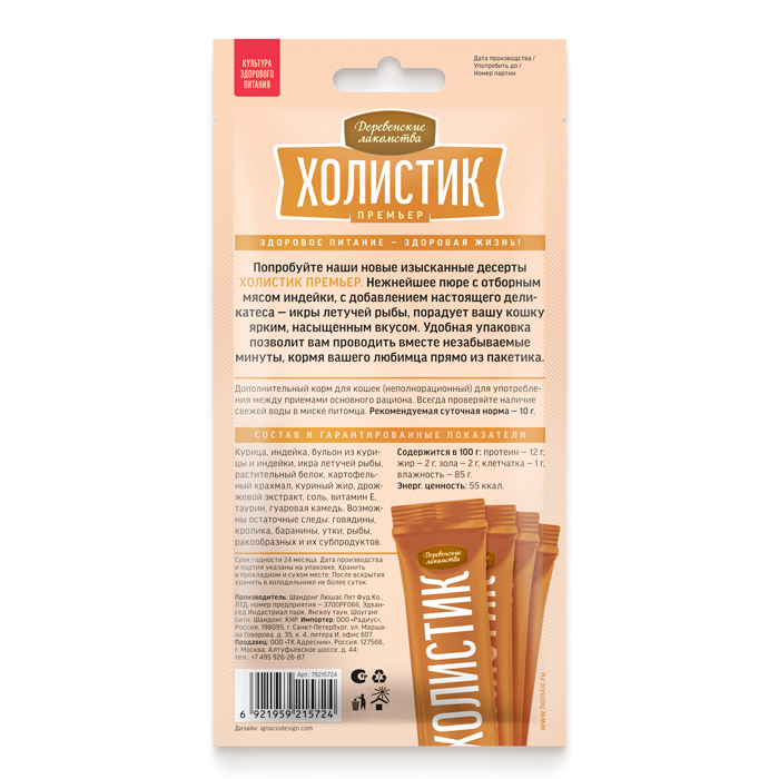 Попробуйте наши новые изысканные десерты «Холистик Премьер». Нежнейшее пюре с отборным мясом индейки, с добавлением настоящего деликатеса — икры летучей рыбы, порадует вашу кошку ярким, насыщенным вкусом. Удобная упаковка позволит вам проводить вместе незабываемые минуты, кормя вашего любимца прямо из пакетика. Дополнительный корм для кошек (неполнорационный) для употребления между приемами основного рациона. Всегда проверяйте наличие свежей воды в миске питомца. Рекомендации по кормлению: рекомендуемая суточная норма — 10 г.