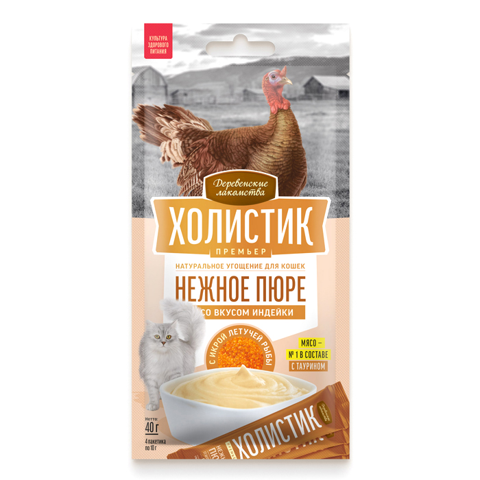 Деревенские Лакомства Холистик Премьер НЕЖНОЕ ПЮРЕ для кошек из индейки с икрой летучей рыбы, 4шт по 10г