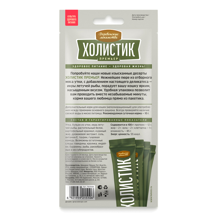 Попробуйте наши новые изысканные десерты «Холистик Премьер». Нежнейшее пюре из отборного мяса утки, с добавлением настоящего деликатеса — икры летучей рыбы, порадует вашу кошку ярким, насыщенным вкусом. Удобная упаковка позволит вам проводить вместе незабываемые минуты, кормя вашего любимца прямо из пакетика. Дополнительный корм для кошек (неполнорационный) для употребления между приемами основного рациона. Всегда проверяйте наличие свежей воды в миске питомца. Рекомендации по кормлению: рекомендуемая суточная норма — 10 г.