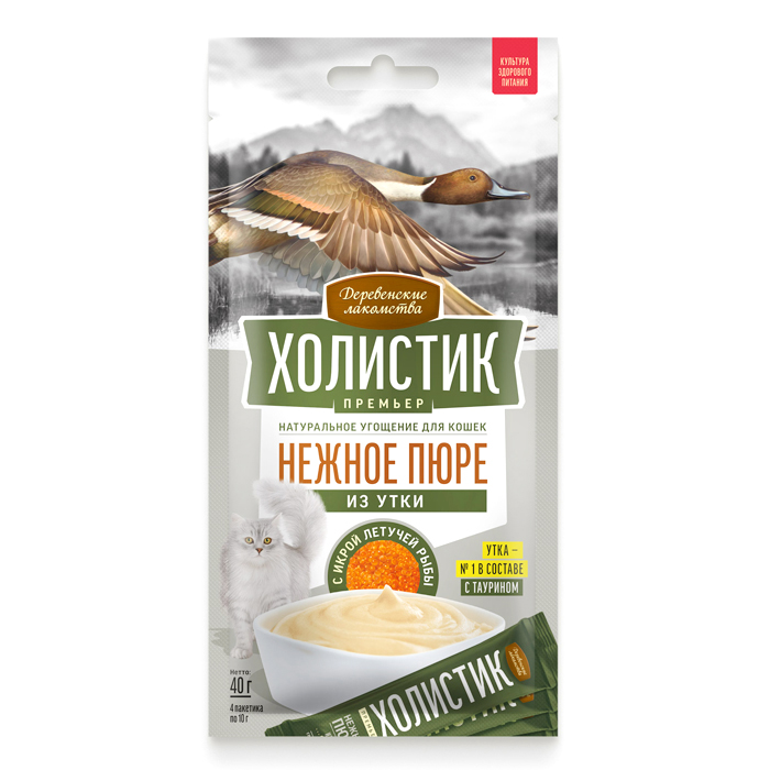 Деревенские Лакомства Холистик Премьер НЕЖНОЕ ПЮРЕ для кошек из утки с икрой летучей рыбы, 4шт по 10г