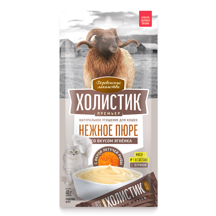 Деревенские Лакомства Холистик Премьер НЕЖНОЕ ПЮРЕ для кошек из ягненка с икрой летучей рыбы, 4шт по 10г