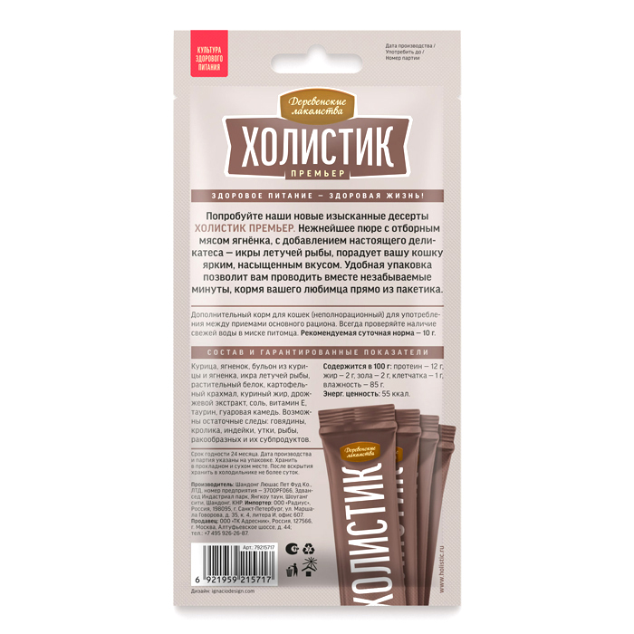 Попробуйте наши новые изысканные десерты «Холистик Премьер». Нежнейшее пюре с отборным мясом ягненка, с добавлением настоящего деликатеса — икры летучей рыбы, порадует вашу кошку ярким, насыщенным вкусом. Удобная упаковка позволит вам проводить вместе незабываемые минуты, кормя вашего любимца прямо из пакетика. Дополнительный корм для кошек (неполнорационный) для употребления между приемами основного рациона. Всегда проверяйте наличие свежей воды в миске питомца. Рекомендации по кормлению: рекомендуемая суточная норма — 10 г.