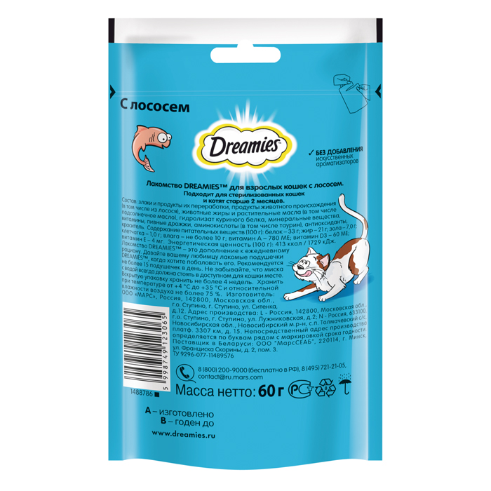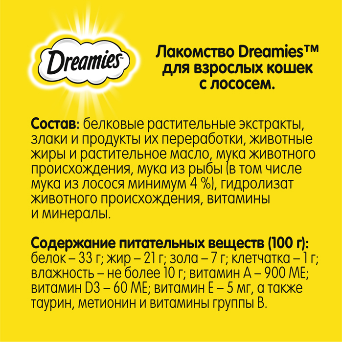 Лакомство Dreamies™ для взрослых кошек, с лососем, 60г. Dreamies с лососем – это лакомство, которое любят все коты на свете. Смело заводите дома аквариум, ваш усатый рыбак больше не обратит внимания на рыбок, ведь есть 30 и даже 60 грамм настоящего, нежного лосося в хрустящей подушечке. Просто рыбная сказка для вашего кота! В состав Dreamies Лакомые Подушечки входят важные для кошки питательные вещества, витамины и минералы, а значит, такое угощение приносит не только радость, но и пользу. Рекомендации по кормлению: Лакомство Dreamies™ - это дополнение к ежедневному рациону вашей кошки. Попробуйте Dreamies™ с курицей, говядиной, сыром, лососем, уткой и микс кошачьей мяты и курицы, чтобы ваш любимец каждый день наслаждался разнообразием вкусов. Ежедневная норма кормления Dreamies™ - до 15 подушек. Не забывайте, что миска с водой всегда должна стоять в доступном для кошки месте.