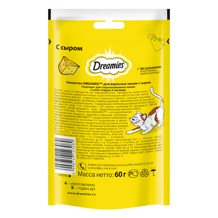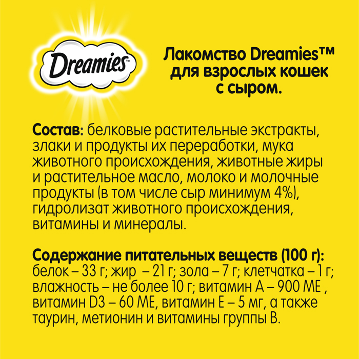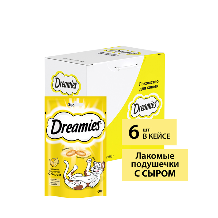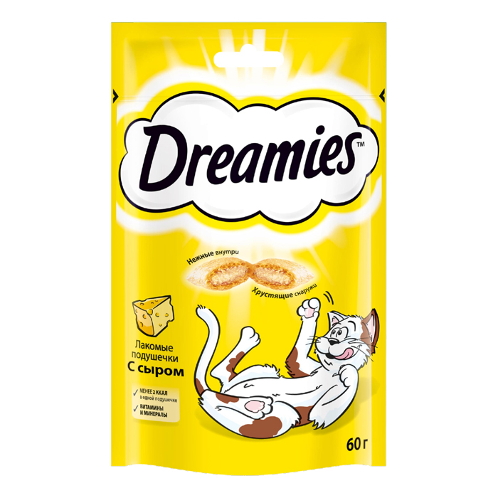 Лакомство Dreamies™ для взрослых кошек, с сыром, 60г. Не удивляйтесь, если при виде Dreamies с сыром, ваш томный кот превратится в самое игривое существо на свете. Это все ради нежного сливочного сыра внутри хрустящей подушечки. 30 и 60 грамм настоящей сырной сенсации! В состав Dreamies Лакомые Подушечки входят важные для кошки питательные вещества, витамины и минералы, а значит, такое угощение приносит не только радость, но и пользу. Рекомендации по кормлению: Лакомство Dreamies™ - это дополнение к ежедневному рациону вашей кошки. Попробуйте Dreamies™ с курицей, говядиной, сыром, лососем, уткой и микс кошачьей мяты и курицы, чтобы ваш любимец каждый день наслаждался разнообразием вкусов. Ежедневная норма кормления Dreamies™ - до 15 подушек. Не забывайте, что миска с водой всегда должна стоять в доступном для кошки месте.