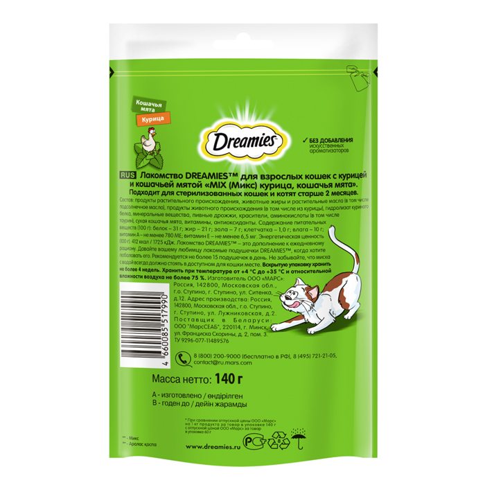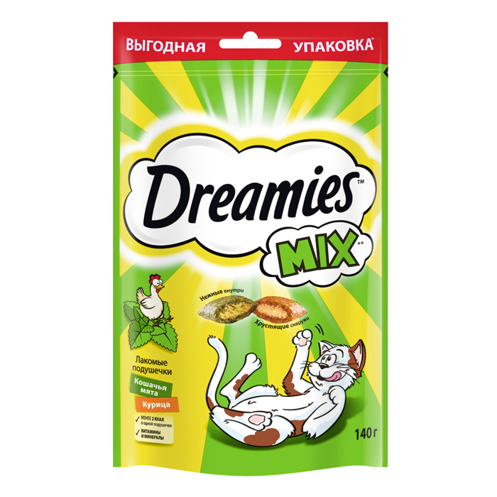 Лакомство Dreamies™ MIX для взрослых кошек, с мятой и курицей, 140г. Лакомство Dreamies™ Mix кошачья мята и курица - это яркое сочетание любимых вкусов вашего питомца! Любимая всеми котиками кошачья мята в сочетании с аппетитной курочкой точно не оставит равнодушным вашего любимца. Лакомство Dreamies™ приносит не только радость, но и пользу вашему питомцу, ведь в каждой хрустящей подушечке с нежным паштетом внутри содержится всего 2 килокалории, а также все необходимые витамины и минералы. Ни один кот не сможет устоять перед хрустящими подушечками Dreamies™ Mix с кошачьей мятой и курицей! Рекомендации по кормлению: Лакомство Dreamies™ - это дополнение к ежедневному рациону вашей кошки. Попробуйте Dreamies™ с курицей, говядиной, сыром, лососем, уткой и микс кошачьей мяты и курицы, чтобы ваш любимец каждый день наслаждался разнообразием вкусов. Ежедневная норма кормления Dreamies™ - до 15 подушек. Не забывайте, что миска с водой всегда должна стоять в доступном для кошки месте.