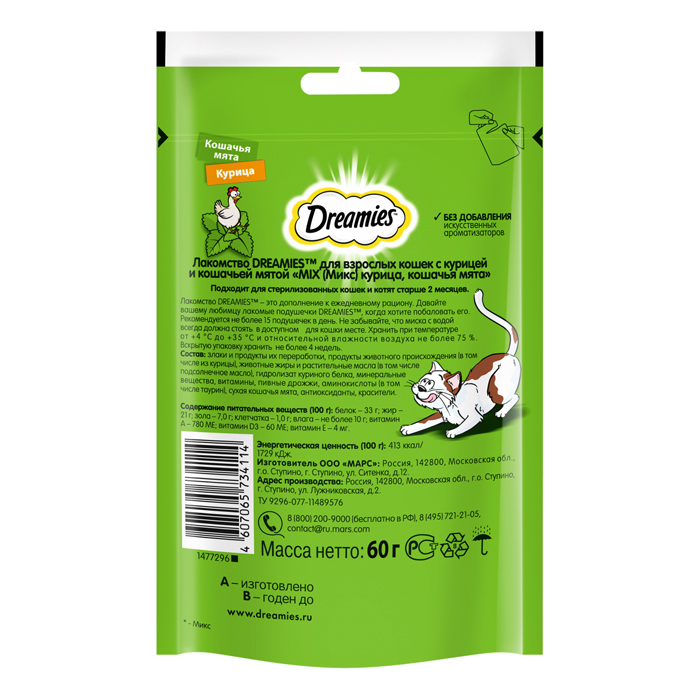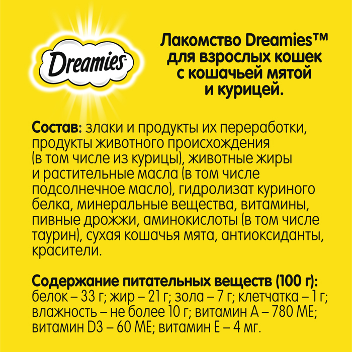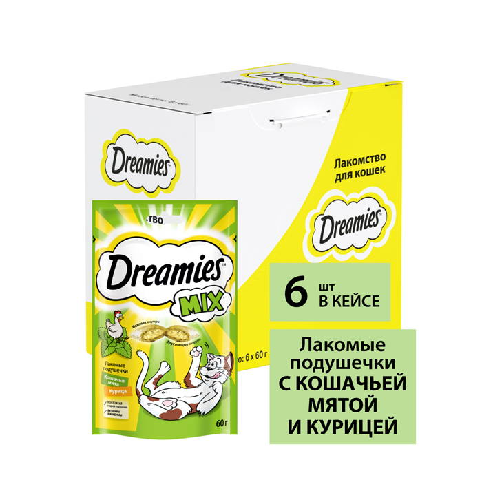 Лакомство Dreamies™ MIX для взрослых кошек, с мятой и курицей, 60г. Лакомство Dreamies™ Mix кошачья мята и курица - это яркое сочетание любимых вкусов вашего питомца! Любимая всеми котиками кошачья мята в сочетании с аппетитной курочкой точно не оставит равнодушным вашего любимца. Лакомство Dreamies™ приносит не только радость, но и пользу вашему питомцу, ведь в каждой хрустящей подушечке с нежным паштетом внутри содержится всего 2 килокалории, а также все необходимые витамины и минералы. Ни один кот не сможет устоять перед хрустящими подушечками Dreamies™ Mix с кошачьей мятой и курицей! Рекомендации по кормлению: Лакомство Dreamies™ - это дополнение к ежедневному рациону вашей кошки. Попробуйте Dreamies™ с курицей, говядиной, сыром, лососем, уткой и микс кошачьей мяты и курицы, чтобы ваш любимец каждый день наслаждался разнообразием вкусов. Ежедневная норма кормления Dreamies™ - до 15 подушек. Не забывайте, что миска с водой всегда должна стоять в доступном для кошки месте.