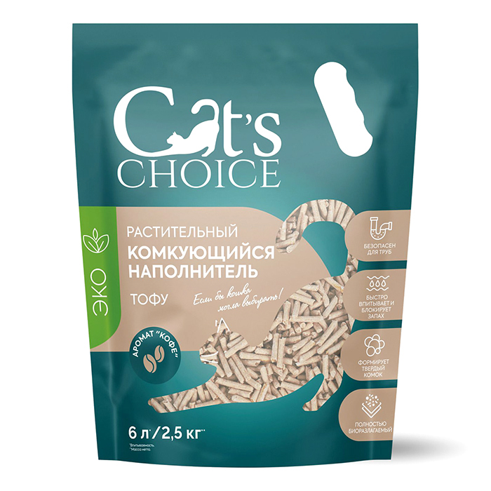 Натуральный растительный наполнитель Cat’s choice из спрессованных соевых волокон с ароматом кофе. Наполнитель быстро абсорбирует влагу и блокирует неприятный запах. Премиальные гранулы диаметром 2 мм обладают способностью образовывать сверхпрочные комки, которые впоследствии легко утилизировать в канализацию. Натуральный состав делает его безопасным длякошек и людей. С Cat’s choice легко поддерживать чистоту и уют в доме.